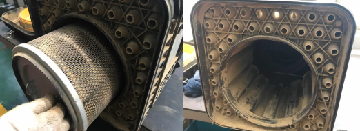 3、清理空氣濾清器一側(cè)的排灰閥,排除里面的灰塵。用氣槍清理濾芯時,要沿濾芯內(nèi)側(cè)向外側(cè)清理,切不可由外向內(nèi)吹(氣槍壓力在0.2MPa),請注意:濾芯在清理六次后應進行更換。